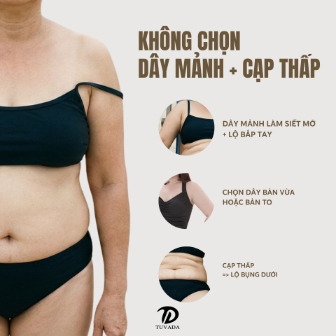 Dây quá nhỏ dễ siết bắp tay, còn cạp thấp lại làm lộ bụng dưới. Thay vào đó, hãy chọn dây bản vừa và cạp cao để tổng thể cân đối hơn.