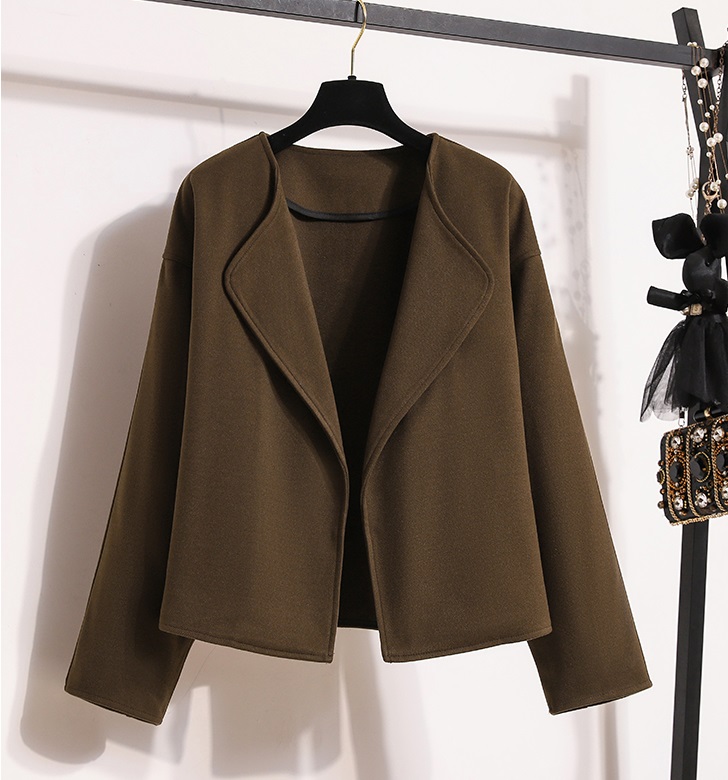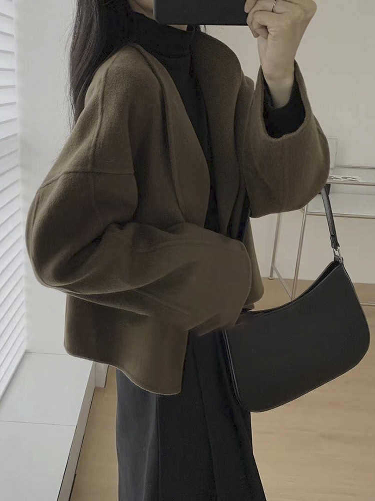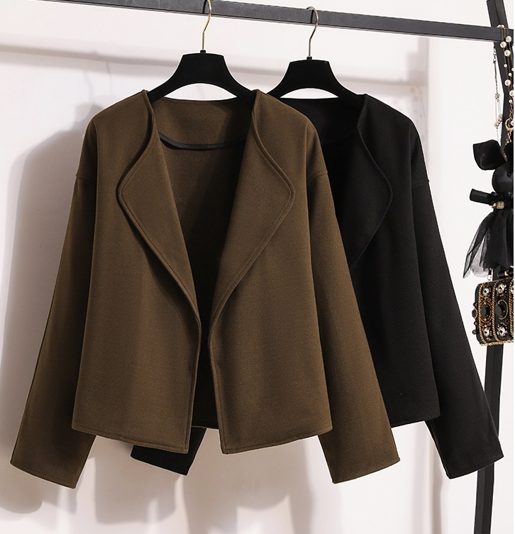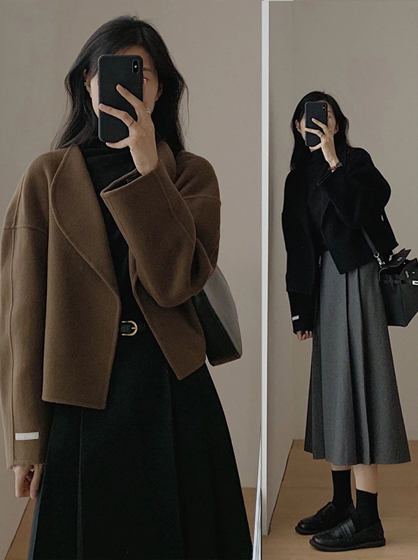 Thiết kế áo khoác: Dáng áo dạ ngắn (crop) trẻ trung, giúp tôn chiều cao và tạo tỷ lệ cơ thể cân đối. Phần cổ áo mở rộng phóng khoáng, đường cắt may tỉ mỉ tạo form dáng đứng cá tính nhưng vẫn mềm mại.