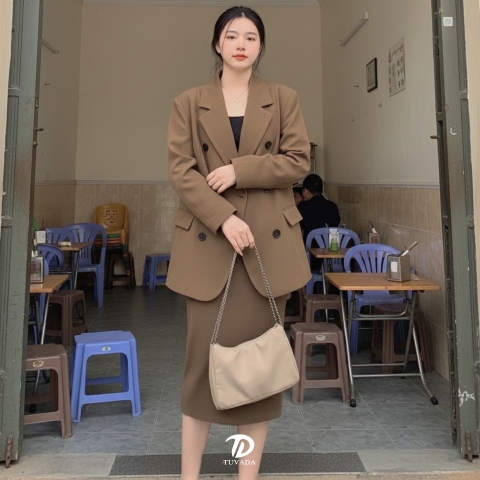 Blazer form rộng + chân váy dài cạp cao