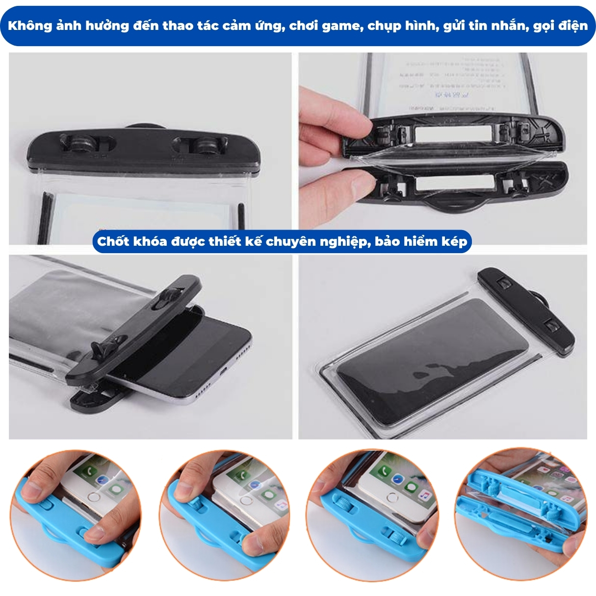Chống Nước Tuyệt Đối: Sử dụng công nghệ khóa kẹp nhựa ABS và viền túi kín, đảm bảo điện thoại được bảo vệ 100% khỏi nước, cát và bụi.